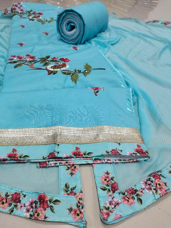 Color: FIROZI Package Contains: 1 Top | 1 Bottom | 1 Dupatta Top Length: 2.20 Mtrs, Bottom Length: 2.40 Mtrs, Dupatta Length: 2.25 Mtrs Type- Unstitched Dress Material Fit Occasions : Ceremonies, Festivals and Any Other Functions Item Weight:500 g Item Dimensions :LxWxH28 x 25 x 3 Centimeters Net Quantity:1.00 count