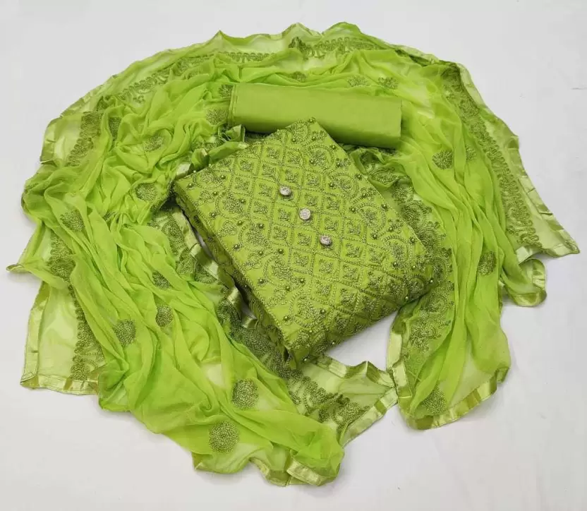 Type:Salwar Suit Material Sales Package:Kurti & Salwar Material With Dupatta Ideal For:Women Occasion:Party & Festive Fabric Care:Do not Iron on print/embroidery/embellishment This Fancy Salwar Suit(dress material) Have Moti Work In Embroidered work Pattern, Top Fabric-Cotton ,Bottom Fabric- Cotton,Dupatta Fabric-Najmeen with Aari Work. Top Cut Size : 2.10 Mtr, Bottom Cut Size : 2 Mtr and Dupatta : 2 Mtr. Bottom Length:2 m Dupatta Length:2.2 m Top Length:2.2 m Color:Light Green Fabric:Cotton Blend Pattern:Embroidered Stitching Type:Semi Stitched Pattern/Print Type:Embroidered Top Length : 2.10 Mtr (Up to Chest Size Of 44 inches), Bottom Length : 2 Mtr and Dupatta Length : 2.00 Mtr. This Women Embroidered Cotton Kurta &