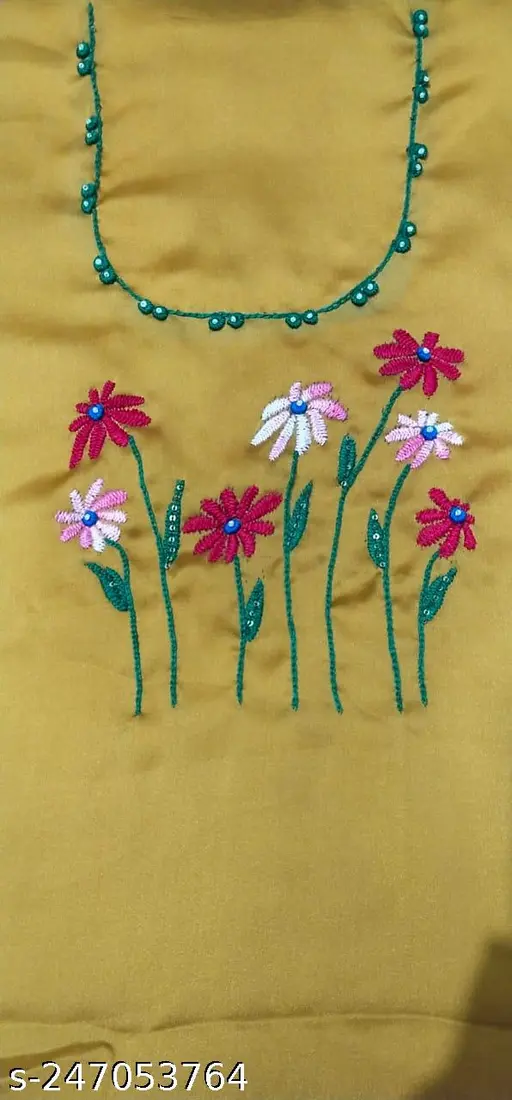Top Fabric : Kora Muslin Lining Fabric : No Lining Bottom Fabric : Kora Muslin Dupatta Fabric : No Dupatta Pattern : Self-Design Yellow color suit with handwork design of flowers on front and slave's worked. Sizes : Free Size Country of Origin : India