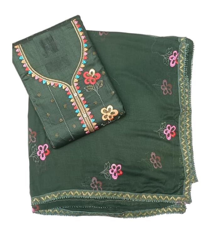 Fabric Detail :: Top - Jam Cotton- 2.50 Mtr, Bottom - Cotton 3 Mtr, Dupatta - Chiffon, Inner - Not Available Suitable For Ethnic::Traditional::Casual::Daily use::Office wear::Work wear::Gift Beautiful unstitched 100% pure Rayon Cotton Sequence embroidery work dress material For women Product Type : - Un-stitched Dress Material / Un-stitched Suit Material / Un-stitched Cotton Suit Material The cotton fabric in this attractive colour unstitched Kurta set and pure Chiffon Dupatta with four sided border Work dupatta will make sure it looks elegant on you. Crafted from cotton fabric, it is light in weight and will be soft against your skin. Its unique design and beautiful colour will fetch a lot of second glances as you club it with contra